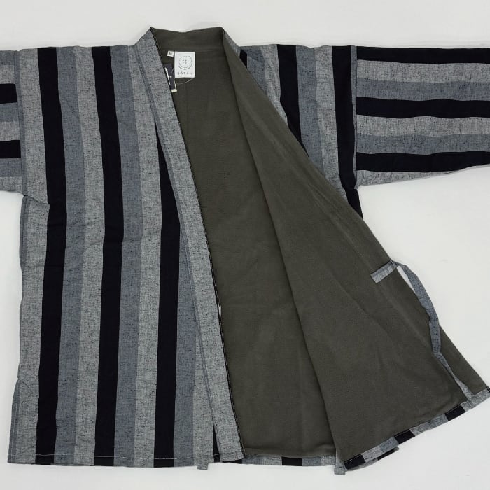 表地は久留米織の綿生地で、裏側はフリース(一部中綿)になっております。